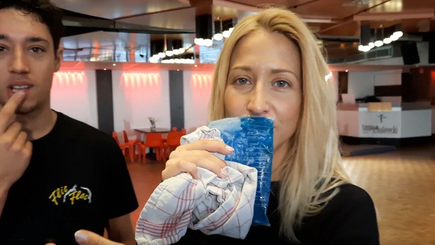 Kathrin Menzinger muss nach einem Unfall beim „Let’s Dance“-Training ihre Lippe kühlen.Bild: rtl.de/screenshot